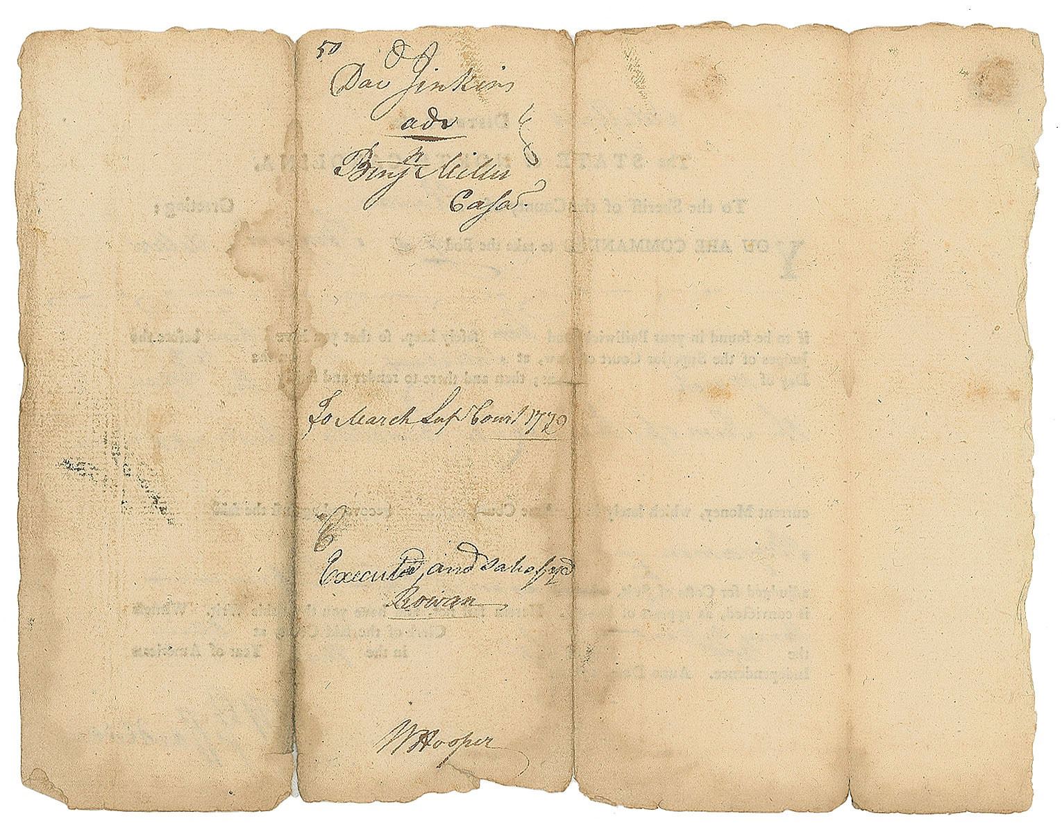 Revolutionary War–dated partial partly-printed DS, endorsed on the reverse, “Wilson,” one page, 3.75 x 6.5, July 1775. The docketing panel from an order issued to a sheriff, ordering two men to appear before the court. Endorsed on the reverse by Wilson to approve a summary of legal fees. In fine condition, with half of the front of the document absent.