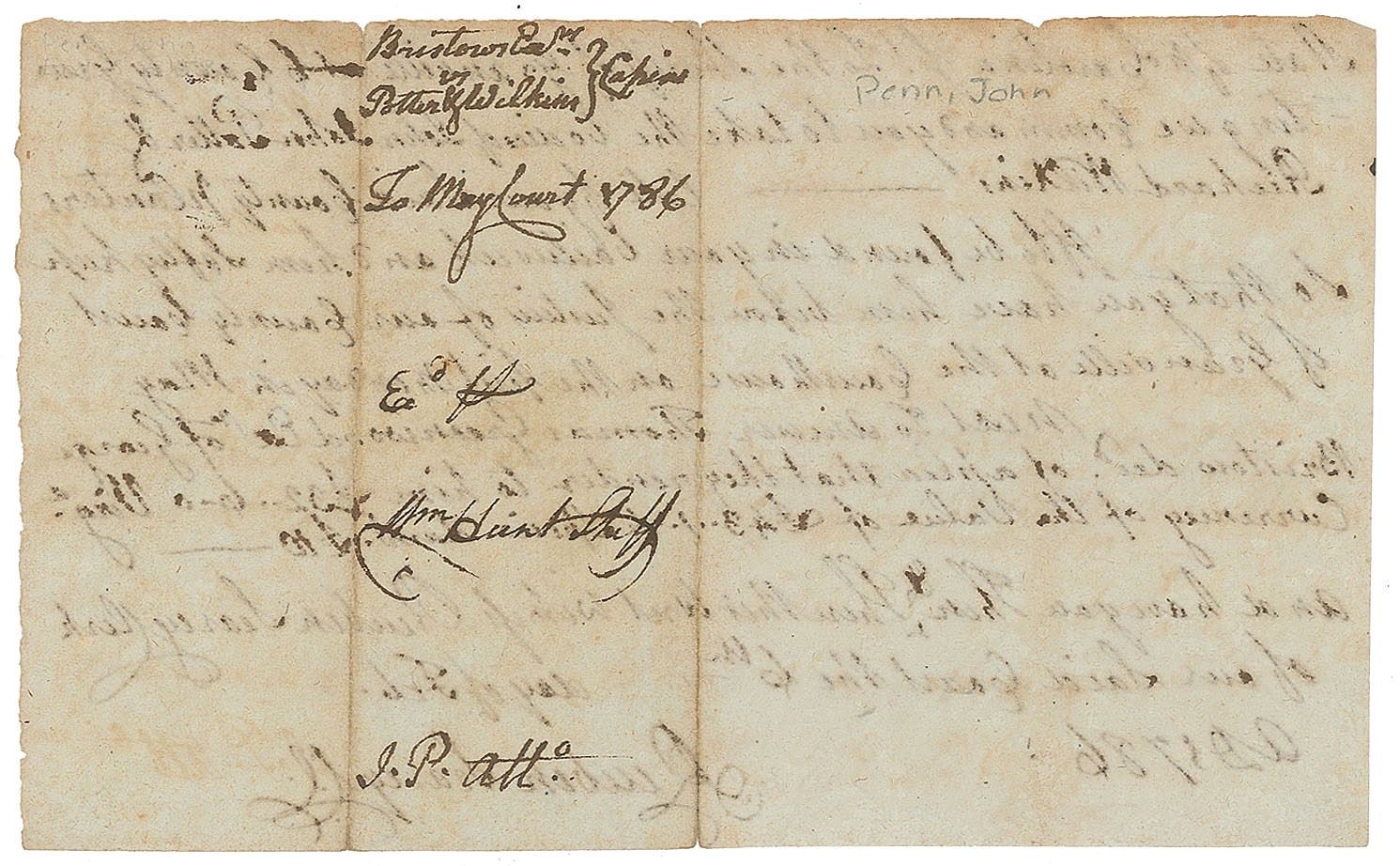 Particularly noteworthy items are: an extremely rare ink signature of Thomas Lynch, Jr.; a 1781 Continental Congress document signed by Arthur Middleton; a 1775 petition to join the Continental Army signed by George Taylor; a 1779 autograph receipt by Lyman Hall; a rare 1761 autograph letter by Francis Lewis; an early 1762 endorsement by John Hancock; and a 1786 land grant by Benjamin Franklin.