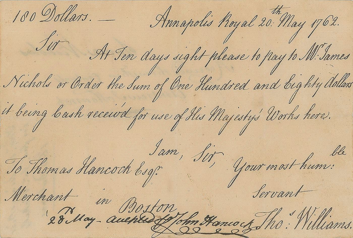 Early autograph endorsement, “28th May—accepted John Hancock,” signed at the bottom of a pay order issued to his uncle Thomas Hancock by Thomas Williams, one page, 6.25 x 4.25, May 20, 1762. In part: "At Ten days sight please to pay Mr. James Nichols or Order the Sum of One Hundred and Eighty dollars it being Cash received for use of His Majesty's Works here." In fine condition. An attractive, early example of his classic signature.