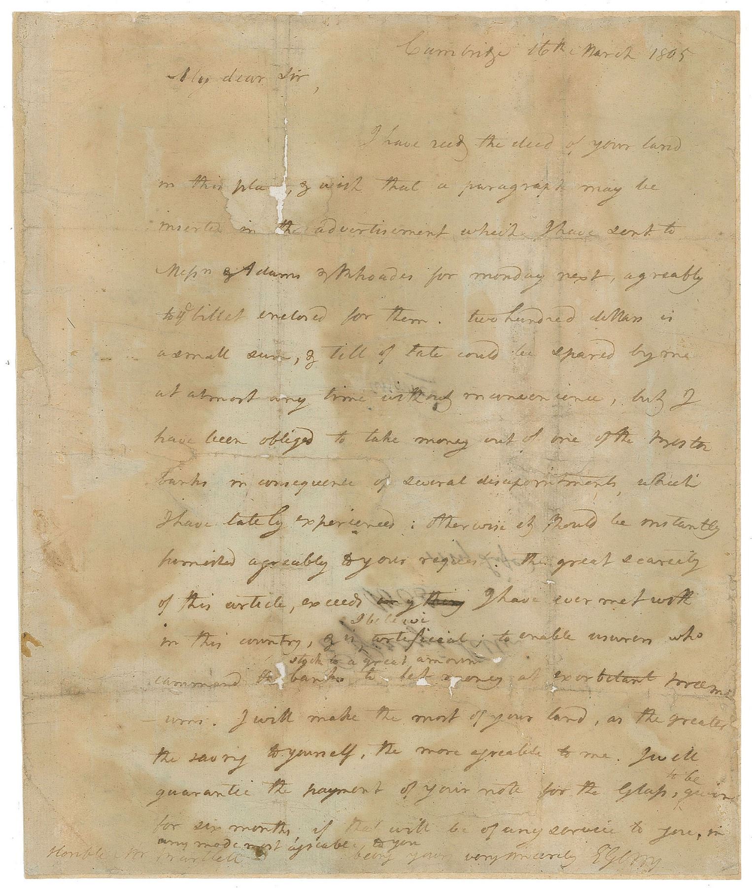 ALS signed “E. Gerry,” one page, 7.75 x 9.25, March 16, 1805. Letter to “Honble Mr. Bartlett,” in part: “I have rec’d the deed of your land…& wish that a paragraph may be inserted in the advertisement which I have sent to Messrs. Adams & Rhoades for Monday next…Two hundred dollars is a small sum, & till of late could be spared by me at almost any time…but I have been obliged to take money out of one of the Boston banks in consequence of several disappointments, which I have lately experienced: otherwise it should be instantly promised agreeably to your request. The great scarcity of this article, exceeds everything I have ever met with in this country.” In good to very good condition, with a strip of tape along the back of the left edge, overall dampstaining affecting appearance but not readability, scattered small areas of paper loss affecting a few words of text, and professional silking to the reverse to reinforce the otherwise fragile paper.