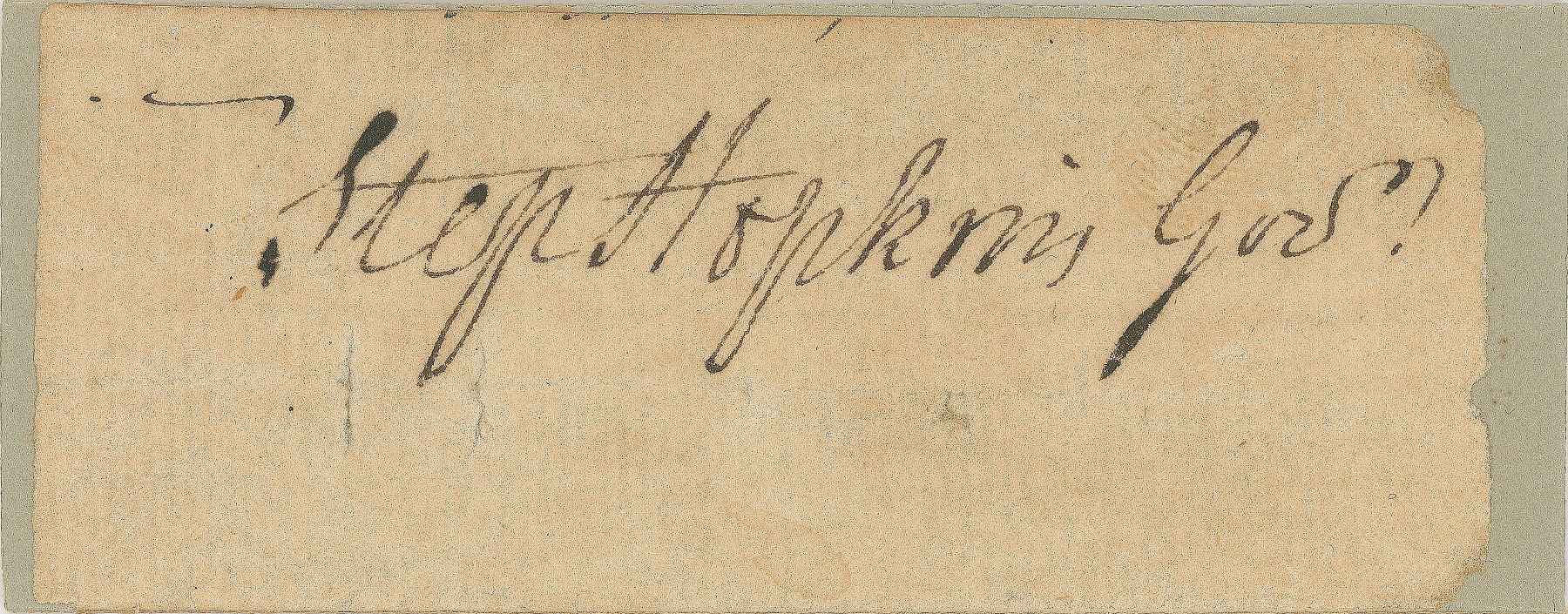 Ink signature as governor of Rhode Island, “Step. Hopkins, Gov’r,” on an off-white 3 x 1.25 slip. Affixed to a slightly larger card and in very good to fine condition.