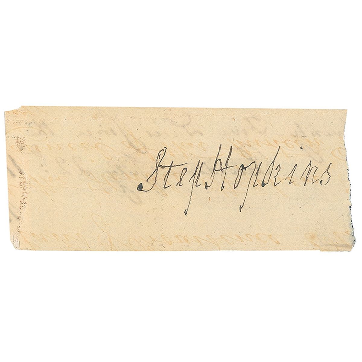 Signer of the Declaration of Independence from Rhode Island (1707–1785) and a delegate to the Continental Congress. Ink signature, “Step Hopkins,” on an off-white 3 x 1.25 slip. In fine condition, with light show-through from writing on reverse, as well as some adhesive remnants to reverse. In his 1995 reference History Comes to Life, Kenneth Rendell places Hopkins’s autograph material into the “rare” category among the Signers.