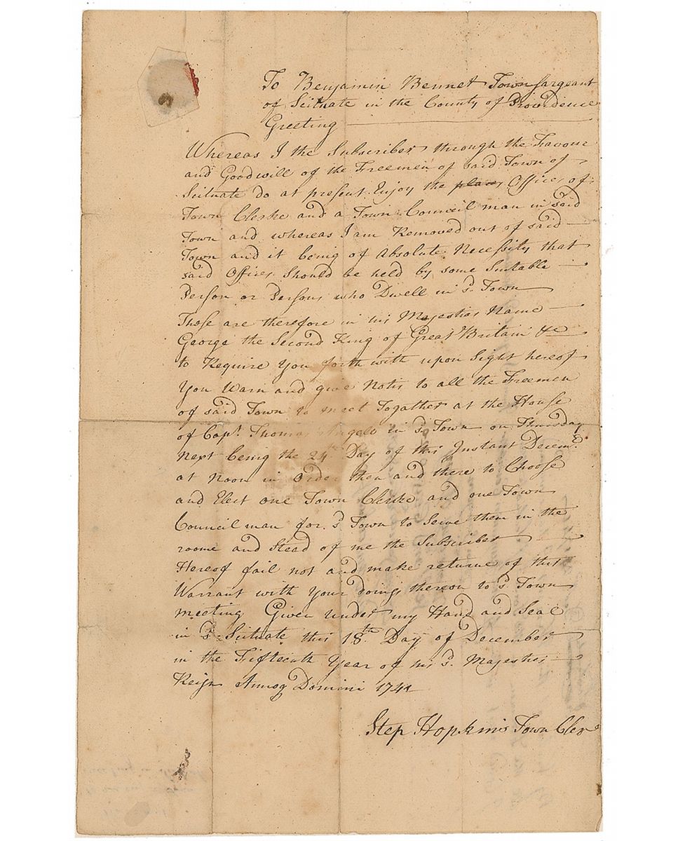 Signer of the Declaration of Independence from Rhode Island (1707–1785) and a delegate to the Continental Congress. Manuscript DS, signed “Step. Hopkins Town Clerk,” one page, 7.75 x 12, December 18, 1741. Document addressed to the Freemen of Scituate. In