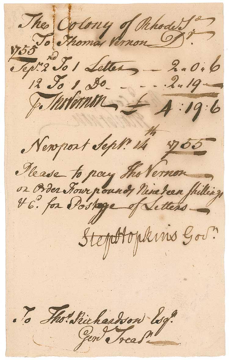Manuscript DS, signed “Step Hopkins Govn,” one page, 4 x 6.25, September 14, 1755. A pay order in the amount of over four pounds nineteen shillings issued to Thomas Vernon, postmaster at Newport, for the postage of letters. A rusty paperclip mark to top edge, a light overall shade of toning, and light show-through from docketing on reverse, otherwise fine condition. In his 1995 reference History Comes to Life, Kenneth Rendell places Hopkins’s autograph material into the “rare” category among the Signers. Pre-certified John Reznikoff/PSA/DNA and RRAuction COA.