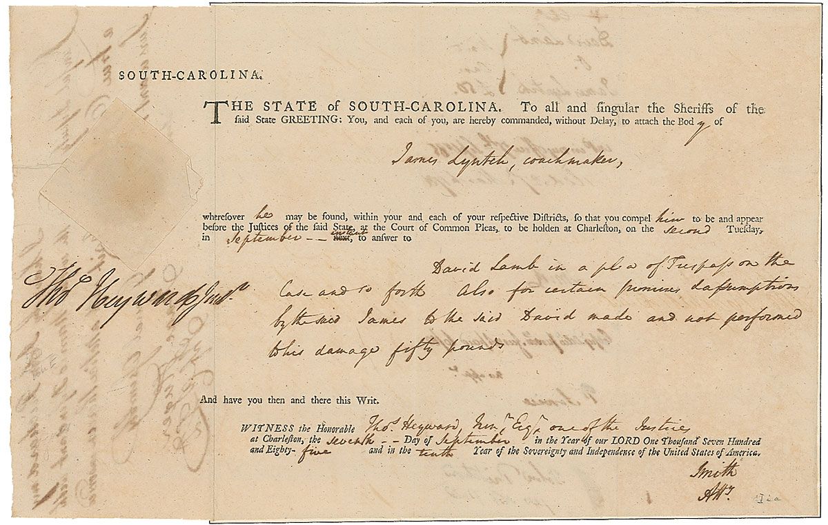 Partly-printed DS, signed “Tho’s Heyward Jun'r,” one page, 13 x 8, September 1, 1785. Arrest warrant issued for coachmaker James Lyntch, “to answer to David Lamb in a plea of Trespass on the Case and so forth also for certain promises & assumptions by the said James to the said David made and not performed to his damage fifty pounds.” Boldly signed on the left side by Heyward below the affixed paper seal, which remains fully intact. Professionally inlaid into a same-size sheet. In fine condition, with a fold to the left side (passing through a single letter at the end of the signature).