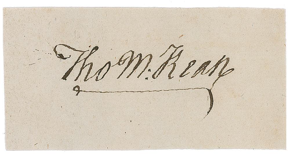 Signer of the Declaration of Independence from Delaware (1734–1817) who later served as a Revolutionary War officer, delegate to the Continental Congress, and Governor of Pennsylvania. Precise ink signature, “Tho M:Kean,” on an off-white 2.75 x 1.25 slip, clipped from a larger document or letter. In fine condition.