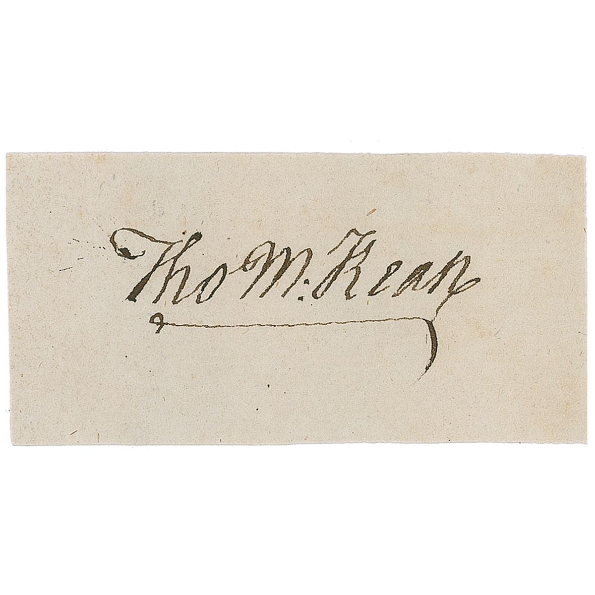 Signer of the Declaration of Independence from Delaware (1734–1817) who later served as a Revolutionary War officer, delegate to the Continental Congress, and Governor of Pennsylvania. Precise ink signature, “Tho M:Kean,” on an off-white 2.75 x 1.25 slip, clipped from a larger document or letter. In fine condition.