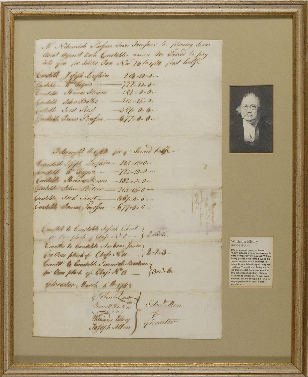 Manuscript DS, one page, 9.25 x 14.5, March 5, 1783. Ellery and three other Selectmen of Gloucester identify the names of more than a dozen individuals and declare “the following…names are ordered to pay into your for Soldier Tax.” Signed at the conclusion by Ellery, John Low, Barnett Warkin, and Joseph Allen. Document is displayed with a biographical paragraph and small photo then framed to an overall size of 15 x 18.25. In very good condition, with intersecting folds, bleeding of some of the ink, some mild toning, red pencil line under signature, and light show-through from docketing on the reverse.