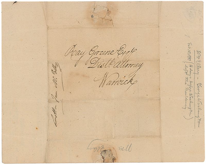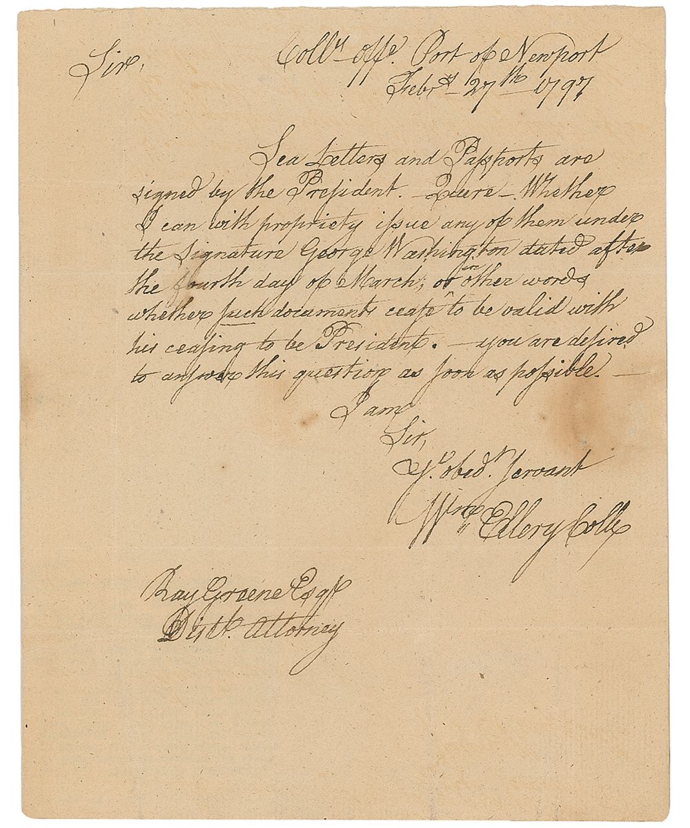 Signer of the Declaration of Independence from Rhode Island (1727–1820). ALS signed “Wm Ellery Coll,” one page, 6.25 x 8, February 27, 1797. Letter to District Attorney Ray Greene. In full: “Sea Letters and passports are signed by the President. Quere: Whether I can with propriety issue any of them under the signature of George Washington dated after the fourth of March; or, in other words, whether such documents ceased to be valid with his ceasing to be President. You are desired to answer this question as soon as possible.” Second integral page bears an address panel in another hand. In very good condition, with intersecting folds, several lightly passing through signature, scattered toning, and slight paper loss and pencil notations to reverse of second page.