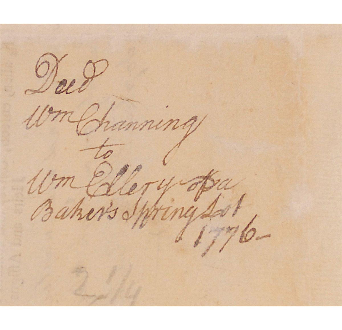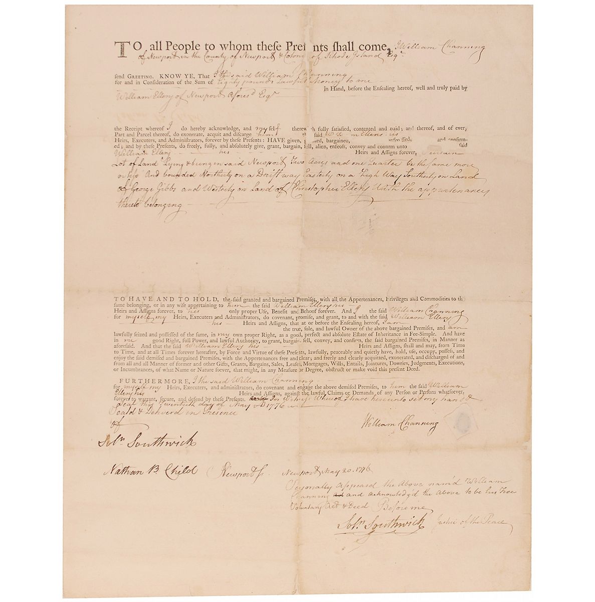 Docketing signature, “Wm Ellery,” dated 1776, and notation on the reverse of an extraordinarily rare 13.25 x 16.75 partly-printed land deed for land being sold to William Channing. Document reads, in part: “To all people to whom these presents shall come William Channing of Newport in the county of Newport and colony of Rhode Island send greeting, KNOW YE, that the said William Channing for and in consideration of the sum of eighty pounds lawful money to me. In Hand, before the ensealing hereof, well and truly paid by William Ellery of Newport aforesd Esq. The receipt whereof I do hereby acknowledge and myself therewith fully satisfied, contented and paid; and thereof, and of every part and parcel thereof . . . lot of land . . . two acres and one quarter be the same more or less and bounded Northerly on a driftway Easterly on a high way Southerly on land of George Gibbs and Westerly on the land of Christopher Ellery.” Docketed on the reverse, “Deed Wm. Channing to Wm Ellery opa Baker’s Spring…1776.” Document has been professionally backed restoring several areas of paper loss. Aforementioned repair and restoration, intersecting folds, uniform toning over docketing panel, backing applied over docketing and signature, and scattered toning and creasing, otherwise very good condition. We know of only three other existing documents, and all sold almost 15 years ago at Christie's. A similar endorsement, Lot 47, sold for over $8000.