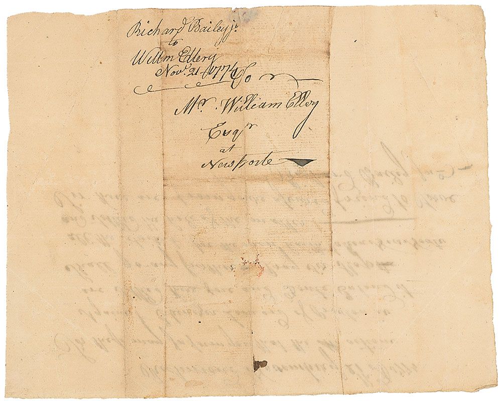 Signer of the Declaration of Independence from Rhode Island (1727–1820). Docketing signature, “William Ellery, Novr. 21—1774,” on the reverse of a one-page manuscript document, 7.75 x 6.25, dated November 21, 1774, signed by Richard Bailey, Jr., concerning the settlement of a suit involving Ebenezer Leonard. In very good condition, with a vertical tear next to signature, intersecting folds, with a horizontal fold through signature, and scattered toning.