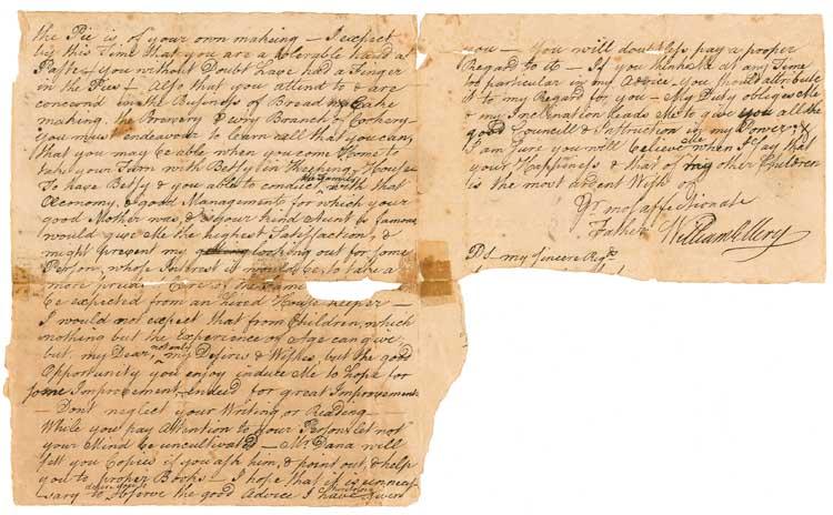 ALS, three pages on two adjoining sheets, 6.25 x 7.5, November 22, 1765. Advice to his daughter Lucy , whom he misses and has not heard from recently. In part, “Also that you attend to & are concerned in the business of Bread & Cake making, the Brewery & every Branch of Cookery. You must endeavour to learn all you can, that you may be able when you come home to take your turn with Betsy in Keeping House. To have Betsy & you able to conduct the family with that economy & good management for which your good Mother was & is your kind Aunt so famous, would give me the highest satisfaction…Don’t neglect your Writing or Reading…let not your mind be uncultivated.” In fair condition, with old tape repairs to complete horizontal separation, several small areas of paper loss, fragile folds, missing bottom portion of second page, and scattered toning and soiling. Ellery’s signature remains quite bold and unaffected by most of the flaws. Pre-certified John Reznikoff/PSA/DNA and RRAuction COA.