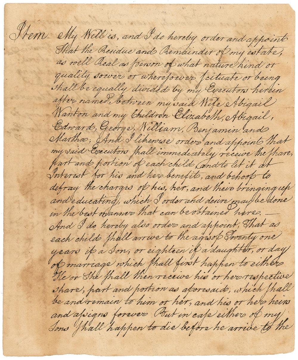 Neatly penned ADS, signed “William Ellery,” one page both sides, 6.25 x 7.5, no date [after 1770]. A docket on the adjacent leaf (now separated) describes the document as “Extract of a paragraph from the Will of George Wanton Esq., deceased.” In part: “My Will is, and I do hereby order and appoint That the Residue and Remainder of my estate…be equally divided by my Executors herein after named between my said Wife Abigail Wanton and my Children Elizabeth, Abigail, Edward, George, William, Benjamin and Martha; And I likewise order and appoint that my said Executor shall immediately receive the share, part and portion of each child, and to let it at interest for his and her benefit, and behoof to defray the charges of his, her, and their bringing up and educating, which I order and desire may be done in the best manner that can be obtained here….” Ellery began practicing law in 1770, providing the likely earliest date for the document. In very good condition, with scattered toning, some heavier, pencil notes to second page, and faint show-through of ink.