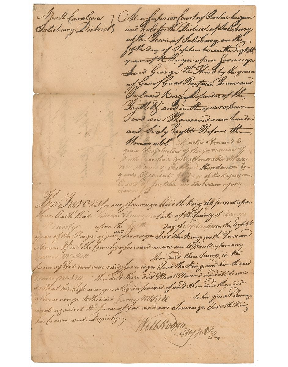 Manuscript DS with substantial portions of the document filled out in Hooper's hand, signed “Will. Hooper,” one page, 7.25 x 12, September 5, 1768. Legal document regarding the complaint of planter William Shenwillen of Anson County against James McNett, claiming that the latter “did Beat, Wound and ill treat [Shenwillen]…so that his life was greatly impaired of and then and there did other wrongs…to his great Damage and against the Peace of God and our Sovereign Lord.” In very good condition, with small edge separations to horizontal folds, some show-through from docketing to reverse, and light staining to the left edge. Hooper was appointed a delegate to the First Continental Congress in 1774, and later to the Second Continental Congress, but much of his time was split between those duties and work in North Carolina, where he assisted in forming the new state government. Interestingly, due to matters in dealing with this new North Carolina government, Hooper missed the vote approving the Declaration of Independence on July 4, 1776, but arrived in time to sign it on August 2. Hooper is considered among the rarest autographs of the Declaration signers.