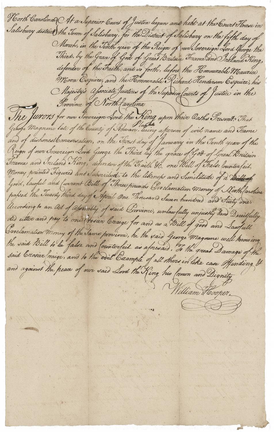 Signer of the Declaration of Independence from North Carolina (1742–1790). Partial ADS, one page, 7.5 x 12.25, March 5, 1770. Hooper has penned the top portion of the document, in part: “At a Superior Court of Justice begun and held at the Court House in the Town of Salisbury, for the District of Salisbury on the fifth day of March, in the tenth year of the Reign of our Sovereign Lord George the Third…before…his Majesty’s Associate Justices of the Superior Courts of Justice in the Province of North Carolina. The Jurors for our Sovereign Lord the King upon their Oaths Present.” The bottom portion of the document is completed in another hand, accusing George Magoune of counterfeiting, with Hooper also writing on the back, “William Steele Crosier Craige.” Intersecting folds (a faint fold through the first letter of his name), a split along one of the vertical folds with a few other areas of paper separation, area of ink erosion to the text, and two mild patches of toning, otherwise very good condition. In his 1995 reference History Comes to Life, Kenneth Rendell places Hooper’s autograph material into the ‘very rare’ category among the Signers—an echelon second only to that occupied by the virtually unobtainable Gwinnett and Lynch.