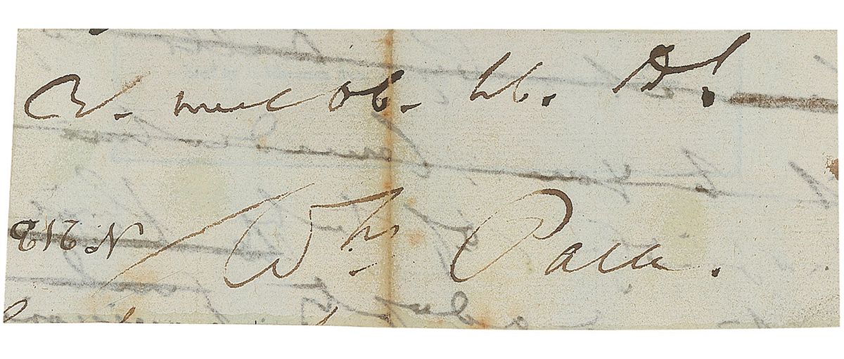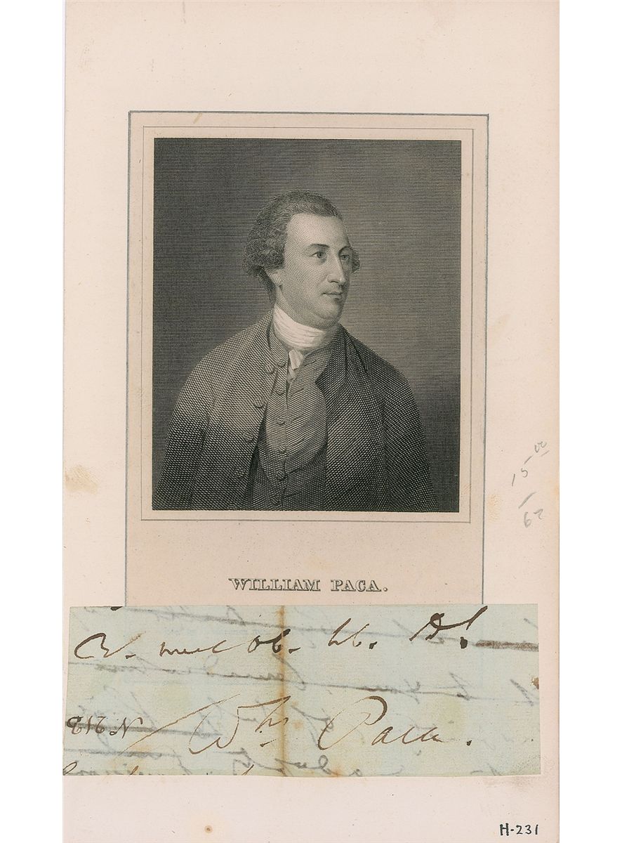 Signer of the Declaration of Independence from Maryland (1740–1799). Ink signature, “Wm Paca,” on an off-white 4.75 x 1.75 slip clipped from the conclusion of a manuscript letter. Affixed below an engraved portrait inlaid into a 5 x 8.75 sheet. In very good condition, with a toned fold passing through a single letter of the signature and show-through from writing to the reverse. Originally purchased from Walter R. Benjamin Autographs and accompanied by a copy of the invoice.