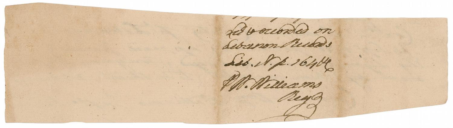 Signer of the Declaration of Independence from Connecticut (1731–1811). Partial self-contained ADS, signed “Wm. Williams, Just. Pacis.,” one page, 7.5 x 2.5, September 14, 1781. Twice-signed partial document, with four lines in Williams’s hand attesting that a gentleman appeared before him, signed at the conclusion, and also signed again on the reverse beneath three short lines of text. In very good condition, with several vertical folds, one through a single letter of one signature, irregular edges, soiling, and a uniform shade of mild toning.