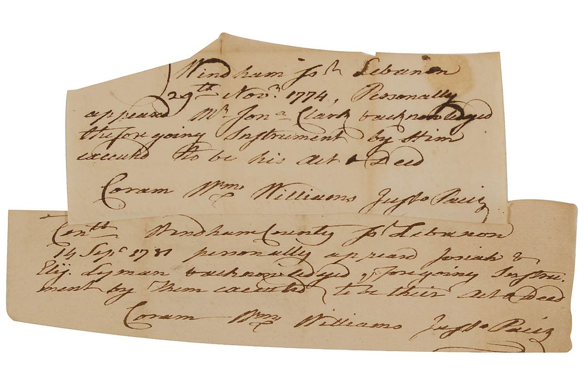 Signer of the Declaration of Independence from Connecticut (1731–1811). Two partial self-contained ADS: one signed “Wm. Williams, Just. Pacis.,” one page, 7.5 x 2.5, September 14, 1781. Twice-signed partial document, with four lines in Williams’s hand attesting that a gentleman appeared before him, signed at the conclusion, and also signed again on the reverse beneath three short lines of text.; and one signed “Wm. Williams, Just. Pacis.,” one page, 6 x 2.5, November 29, 1774. Williams attests that Jonathan Clark appeared before him. In very good condition.