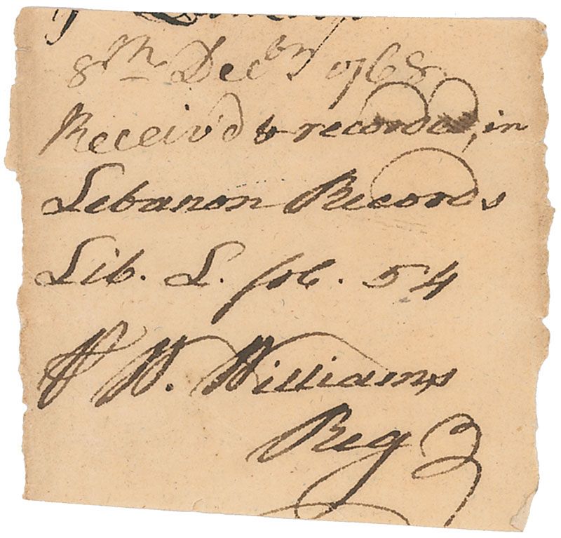 Signer of the Declaration of Independence from Connecticut (1731–1811). Ink signature, “W. Williams,” on an off-white 2.25 x 2 slip clipped from a larger document dated December 8, 1768. In fine condition, with a few diagonal creases, one passing through first initial of signature.