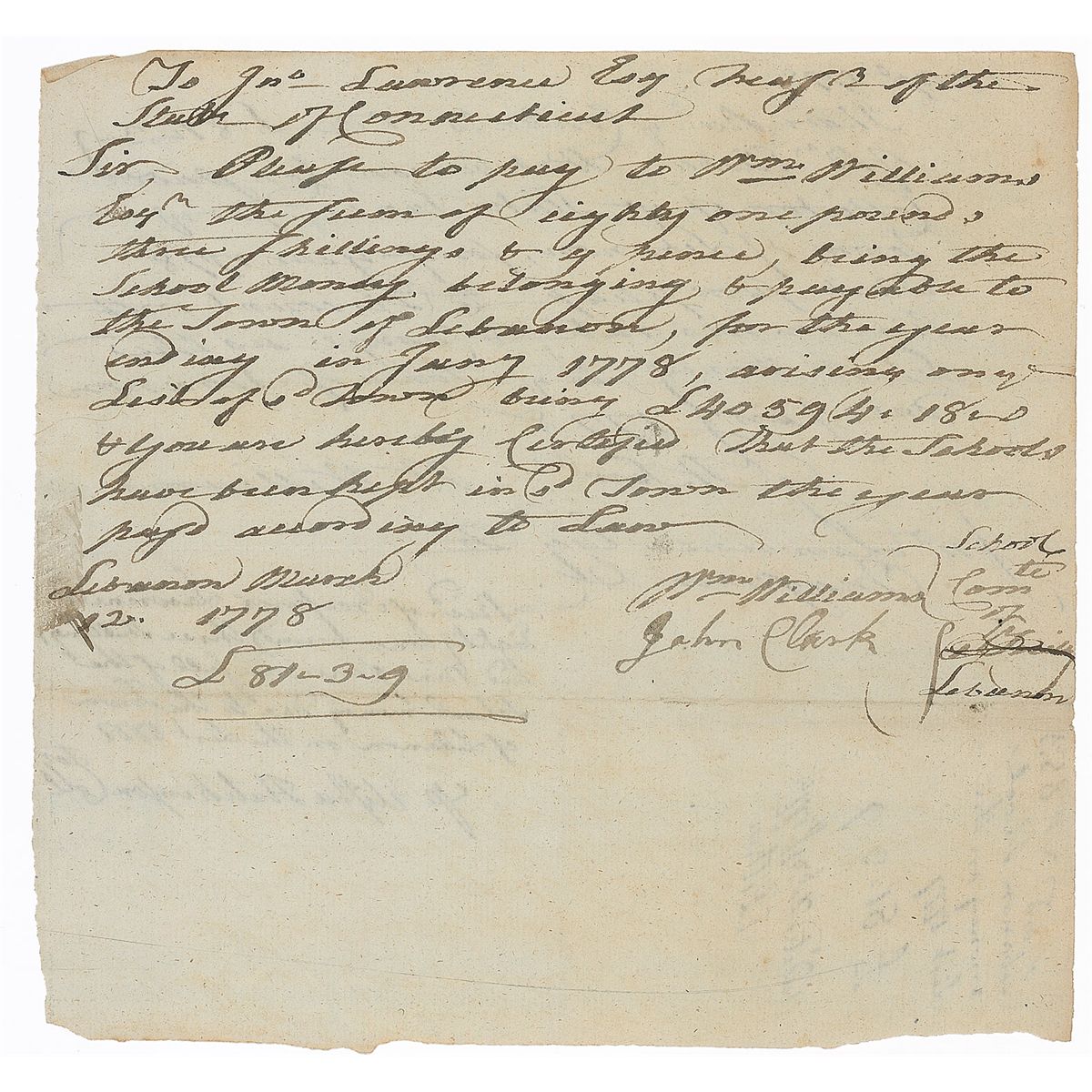 Signer of the Declaration of Independence from Connecticut (1731–1811). ADS, signed “Wm. Williams,” one page, 7.25 x 6.75, March 12, 1778. Williams orders the treasurer of Connecticut to “pay to Wm. Williams Esq. the sum of eighty one pounds three shillings & 9 pence being the school money belonging & payable to the Town of Lebanon.” In fine condition, with intersecting folds.