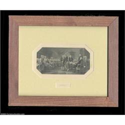 Declaration of Independence large engraved vignette by Frederick Girsch that originally appeared on First Charter $100 National Bank Notes (Fr 452-463) and was adapted for the Series 1976 Bicentennial $2 Federal Reserve Note (Fr 1935). This superb engraving measures approximately 5.5" by 2.75" on card, with small Bureau of Engraving and Printing imprint below. It is has been matted and mounted in a brown wood frame, 9.5" by 11.5". Vignette and frame are somewhat foxed. Important notice: We expect to be auctioning lots at the rate of 200-250 per hour. Sometimes eBay Premier live bid software cannot keep up with that pace, so we strongly recommend that you place a realistic proxy bid now as insurance to avoid disappointment. Also please note that all Heritage/CAA lots purchased through eBay Premier carry a 20% Buyer's Premium. Please make sure you read the Terms and Conditions.