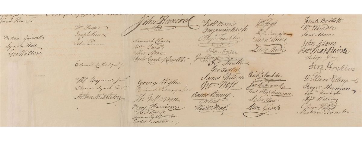 Striking rice paper reproduction of the Declaration of Independence, 25.25 x 29, printed by Peter Force in 1848 for inclusion in his series American Archives, beginning, “In Congress, July 4, 1776. The Unanimous Declaration of the Thirteen United States of America.” Broadside is removably encapsulated in acid-free Mylar. In very good condition, with previous storage folds, several well-done professional repairs, mainly along one vertical fold, and 1.75? x 4.25? area to lower left, affecting only the line of printer’s information, trimmed right and top edge, some light toning to right edge from previous tape, extra creasing along central vertical fold, and light mirroring of ink from folding.