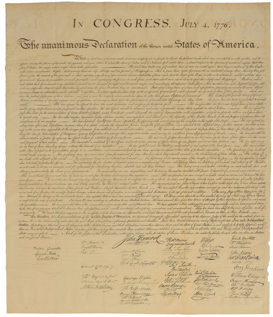 Striking rice paper engraving of the Declaration of Independence, 25.25 x 30, printed by Peter Force in 1848 for inclusion in his series American Archives, beginning, “In Congress, July 4, 1776. The Unanimous Declaration of the Thirteen United States of America.” In very good to fine condition, with repairs on the reverse to separations along the rightmost vertical fold (resulting in some of the text of the document not quite matching up perfectly). By 1820, the original Declaration of Independence had seriously deteriorated due to inappropriate handling and storage, creating an immediate need for a facsimile reproduction. Commissioned by John Quincy Adams, William J. Stone engraved a copperplate by lifting ink directly from the original and creating a perfect copy. He printed 201 before placing the plate in storage for safekeeping.
