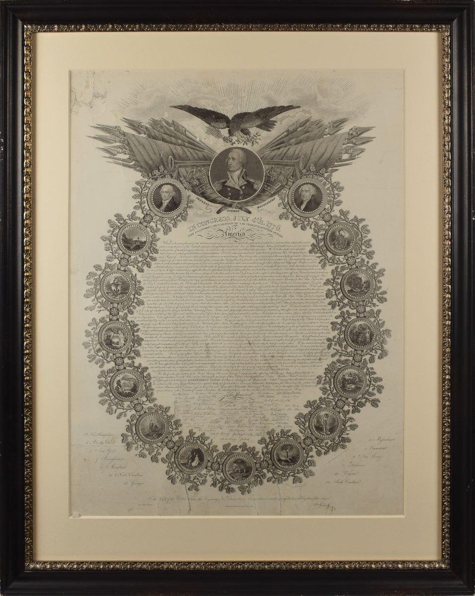 Rare broadside engraving of the Declaration of Independence, 21 x 28, with dedication along the bottom, “To the People of the United States this Engraving of the Declaration of Independence is most respectfully inscribed by their fellow citizen, Wm Woodruff,” and "Copy Right Secured, Published by Phelps & Ensign 7½ Bowery, N.Y.” Declaration text set within an ornate frame formed by a wreath and seals of the thirteen original colonies, and topped by a vignette of flags, an American Heraldic Eagle, and portraits of Washington, Adams, and Jefferson. Matted and framed to an overall size of 29.75 x 37. In good to very good condition, with repairs to several tears, some to edges and some to body, small areas of paper loss and defects, scattered light soiling. Woodruff’s broadside is perhaps more scarce and desirable than the more familiar copies produced by William J. Stone or Peter Force. His uniquely designed circa 1841—1843 creation was patterned after an 1819 version and is the original copy once used to make commemorative versions for the nation’s 1976 Bicentennial celebration. A visually pleasing example.