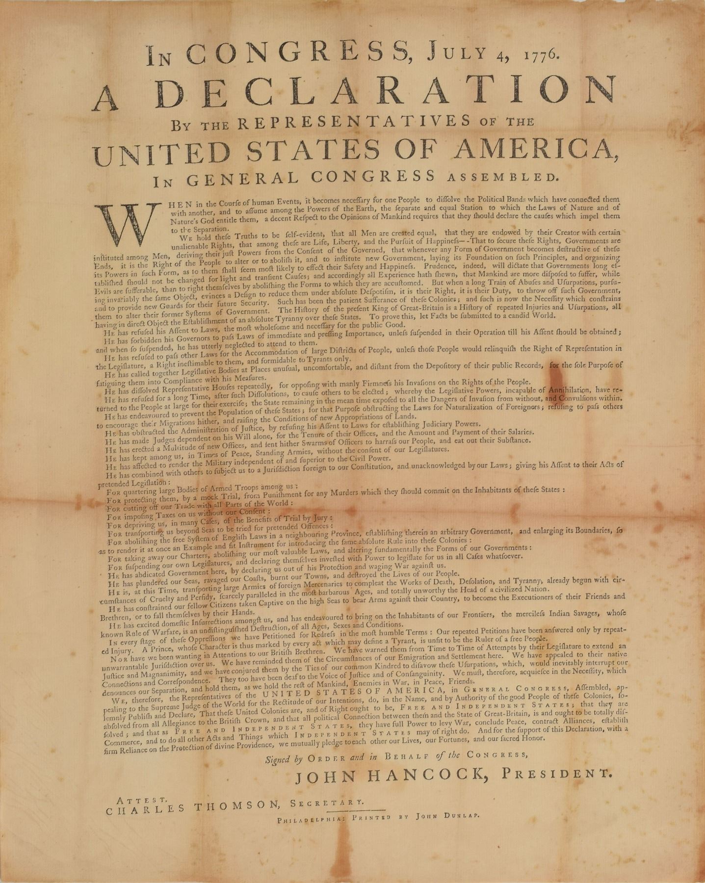 Facsimile copy of the first printing of the Declaration of Independence, 15.5 x 19.5, produced by R. R. Donnelley & Sons Company in 1970 from an original Dunlap broadside. On the reverse at the lower margin is printed, "Facsimile Reproduced by R. R. Donnelley & Sons Company, The Lakeside Press from the original owned by Ira G. Corn, Jr. and Joseph P. Driscoll." In fine condition.