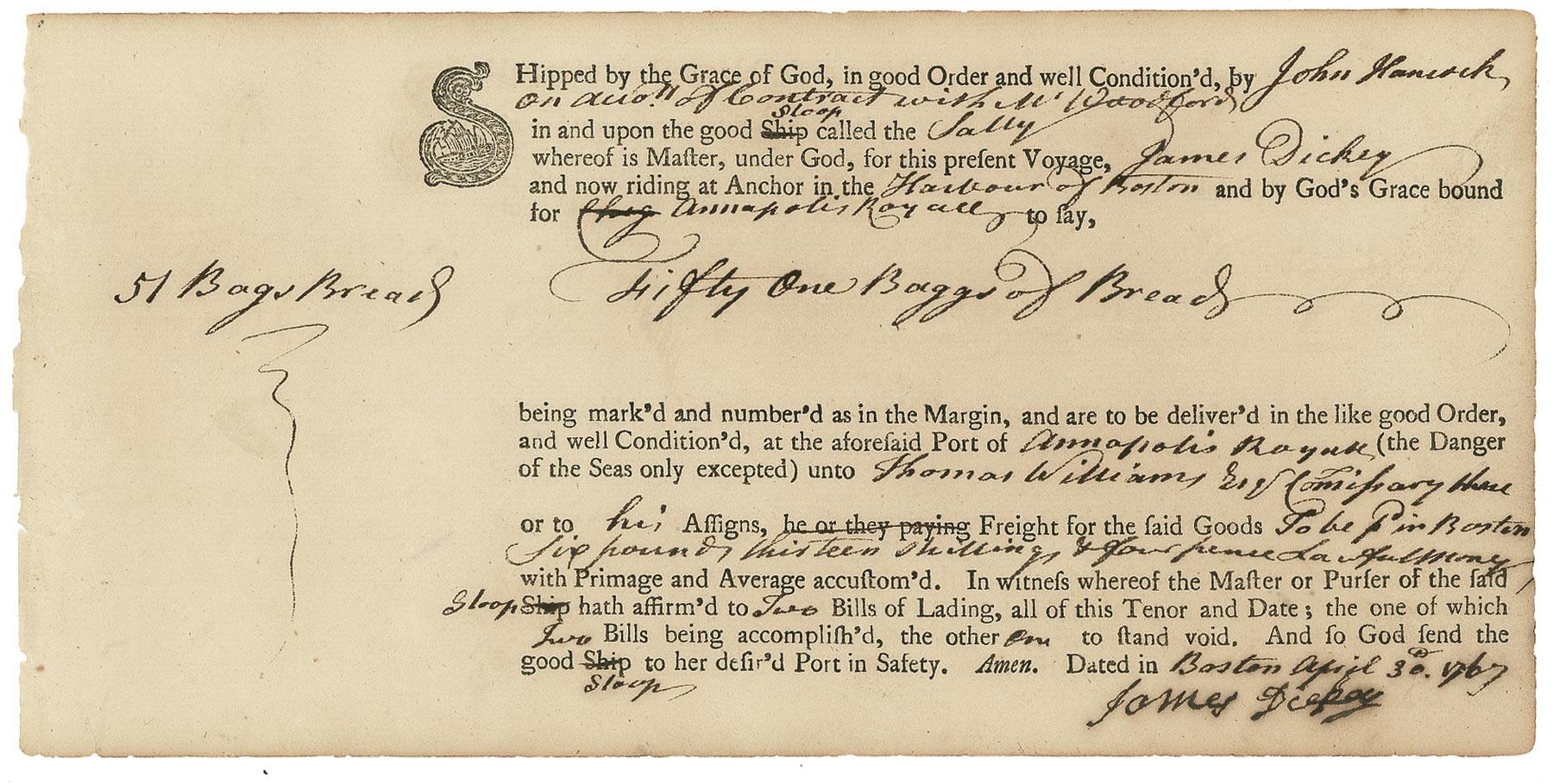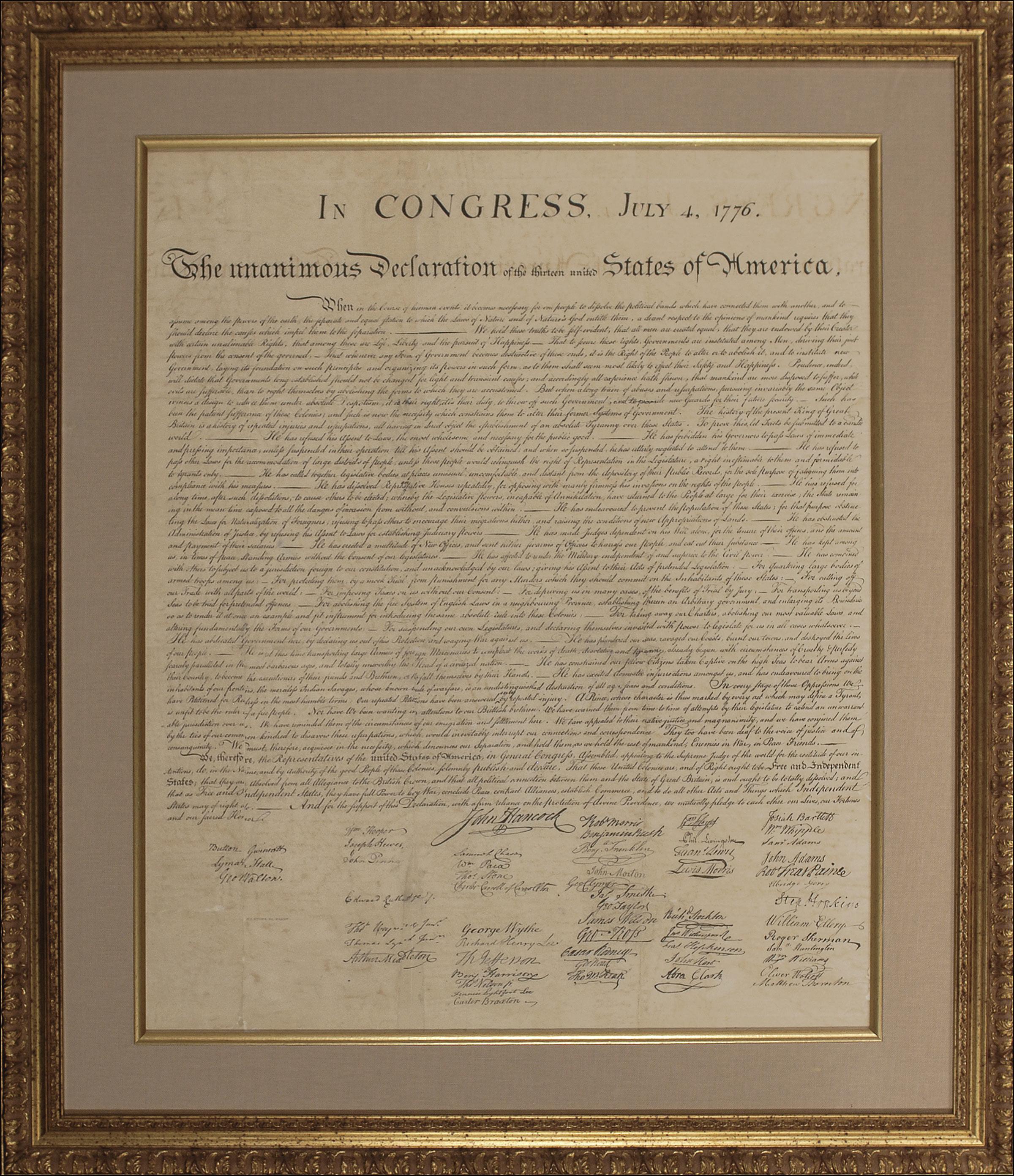 Striking rice paper reproduction of the Declaration of Independence, 24.5 x 30.5, printed by Peter Force in 1848 for inclusion in his series American Archives; and accompanied by a partly printed unsigned DS filled out in Hancock’s hand (and including his surname “Hancock”), one page, 9 x 4.5, April 30, 1767. A bill of lading which reads, in part: “Shipped by the Grace of God, in good Order and well Condition’d, by John Hancock in and upon the good Sloop called the Sally…and now riding anchor in the Harbour of Boston and by God’s Grace bound for Annapolis Royall to say Fifty One Baggs of Bread.” Print has been beautifully archivally cloth matted and framed to an overall size of 34 x 39.5. Print is in fine overall condition, with previous storage folds, well-done professional repairs to fold separations and tears on reverse, professional silking to reverse, and some light ink transfer to print. Document also rates fine, with some light creasing and toning.