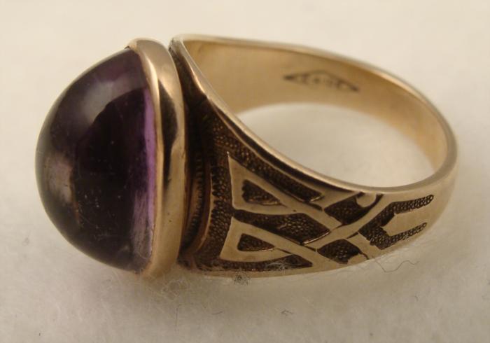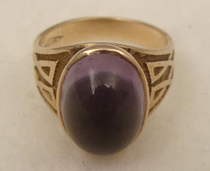 This 10Kt gold ring has an oval cabochon amethyst, and a Celtic style design on the sides. The size is 5 1/2, and the stone measures 24mm and 13mm high. It is in excellent condition.