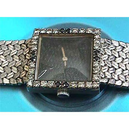 With original solid 14 carat gold ultra flexible cross-thatch band, diamond and sapphire adorned bezel black tone dial, and fine inconspicuous hands.