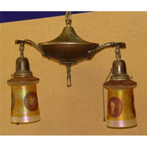 </font></strong>With 2 stylized arms flanking a bulbous center, housing a matching pair of period etched and iridized flower adorned art glass bell form shades.