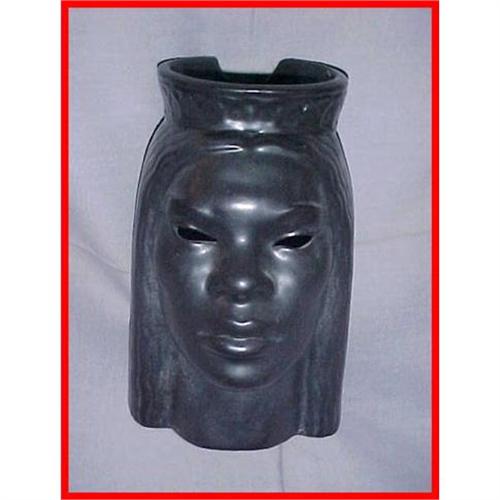 This large 11-1/2" tall Deco/Arts & Crafts pottery headvase of a Tahita woman is stamped on the bottom "Celebrate Made in USA". This early pottery headvase has the eyes cut-out of the pottery. Semi-matte gun metal glaze over a buff colored clay body. Good condition with typical crazing and slight scuffing.