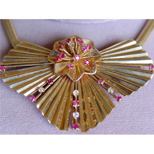 Ultra flexible 14kt Yellow Gold wavy s-pattern necklace, ruffled Art Deco styled butterfly form necklace which can also serve as a brooch, set with rubies and diamonds. It is made of solid 14kt gold and weighs almost 2.5 ounces and because it can be used as both a necklace and a brooch it's like getting 2 pieces for the price of 1 and would make a superb gift for that special someone. Size: 14 inch (necklace), 3 x 2 inch (brooch), Weight 68 grams (over 2oz).