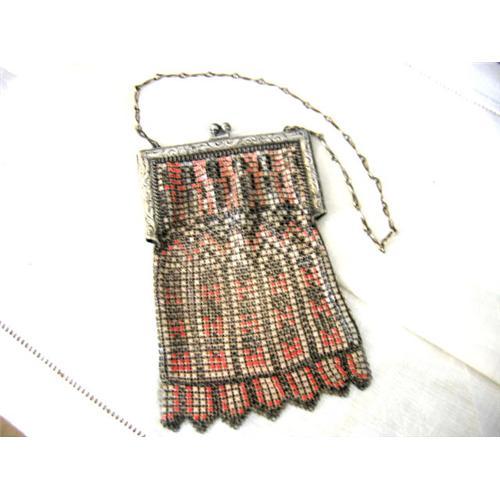 This is a delicate and lovely Art Deco/flapper era antique purse. The frame is silver with an embossed pattern of stylized leaves; the rest is enamelled silver mesh with a geometric pattern in coral color, ivory, and black. There is the small silver tag on the inside marking it as made by Whiting & Davis.