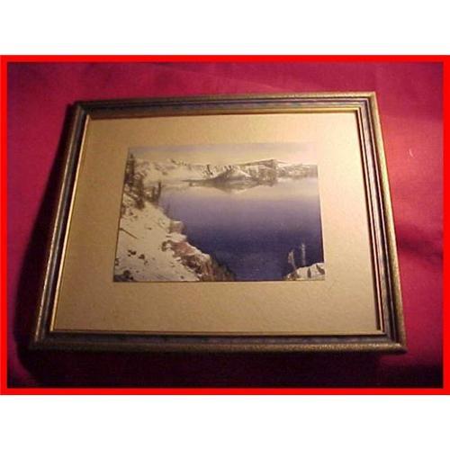This 7" by 9" hand-tinted photograph is of Crater Lake. The photo is stamped "Kiser" and signed in pencil "Kiser". The photo is framed in a 13" by 15-1/2" Deco period wood frame. Fred Kiser was a commercial photographer between 1901 through the late 1920's. Kiser worked on photography for the Great Northern Railway. There is a gift note on the back dating the photo from June 1927. Good condition with minor scuffing on original frame.