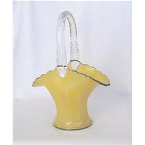 Deco Glass Basket in Gold with Black Trim and Clear Handle. Painted and Fired. Circa 1900 to 1920. Very Rare. Good Condition.