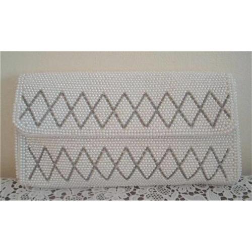 This purse is so lovely. Made in Japan, the front and back are totally covered in small pearl color beading with the front having a hand stitched geometric design of silver glass bugle beads in elongated crystals, Art Deco styling. You really have to see it to appreciate the work that has gone into this purse and feel the weight of all the beading. The lining is white satin and there is a fabric label inside that says: Made In Japan - tiny lipstick mark under the opening flap, which I have shown in the photo. There is a small open flap pocket inside. There are no loose or missing pearls or beads. Measurements are 7-3/4" inches wide, the length is 4-1/4" inches.