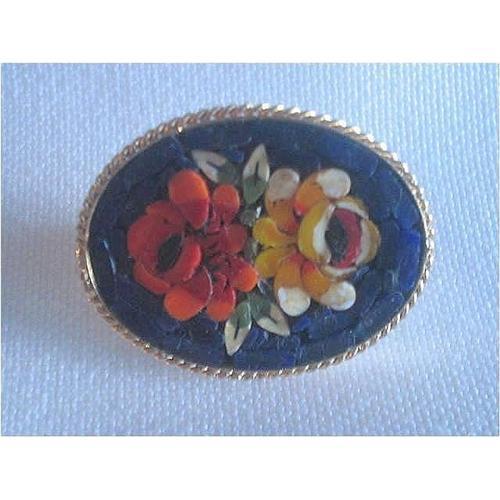 A very lovely and beautifully hand made micro mosaic brooch / pin, oval in shape with a design of flowers in reds and yellow gold colours with green leaves on a black background - very pretty and colorful. The backing is gold tone brass and the close is an older "C" close. Measures 1-1/4" inches wide from east to west and is just under 1" inch in height. Excellent condition.