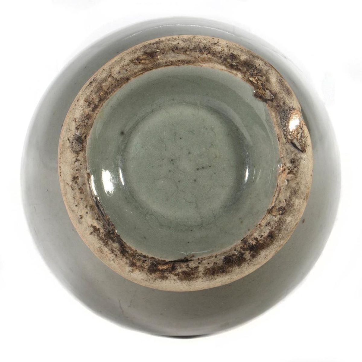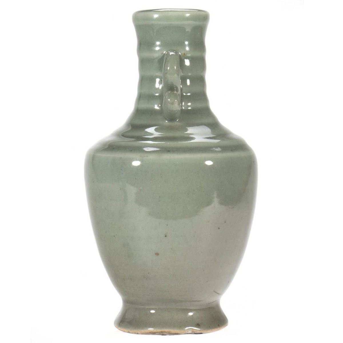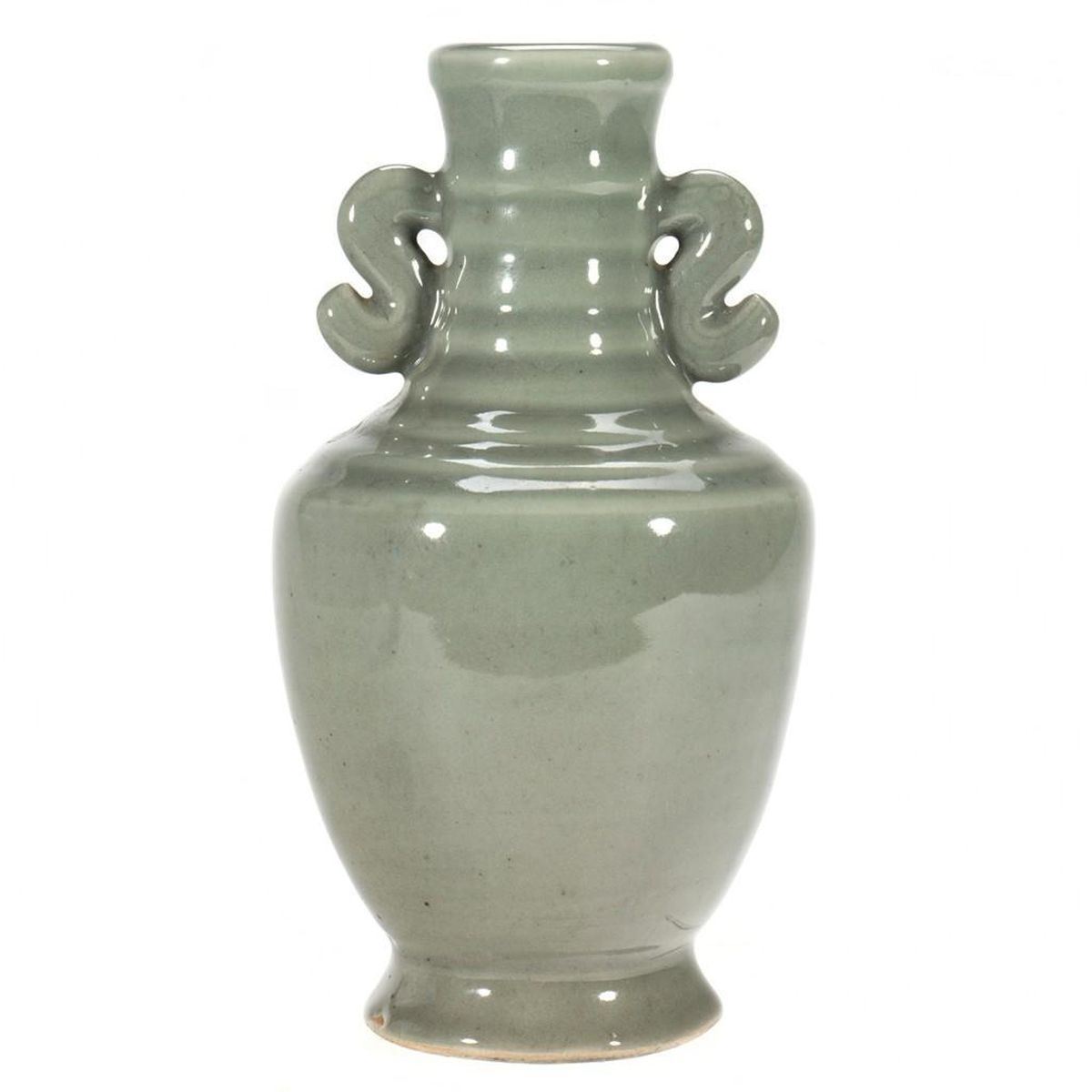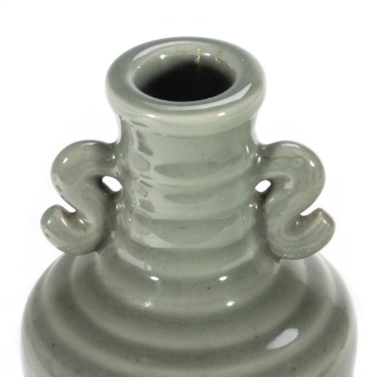The grey-green stick neck vase with scrolled handles. 8in. (20cm) h. Condition: Minor chip to edge of foot.
