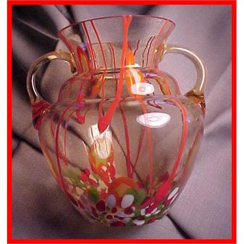 This squatty 7" tall art glass vase has an acid-etched "Czechoslovakia" on the bottom. The vase has a scattering of red, yellow and white spots/lines on a warm clear background. The colors are heavier on the bottom on this Deco period vase. Good condition wiith a typical ground rim and a maker's flaw on the handel(SEE PHOTO). A really pretty piece of vintage signed Czechoslovakian art glass. I bought it several years ago from a Midwestern antique shop.