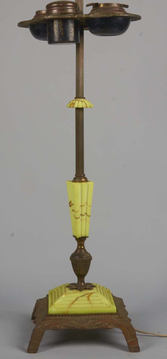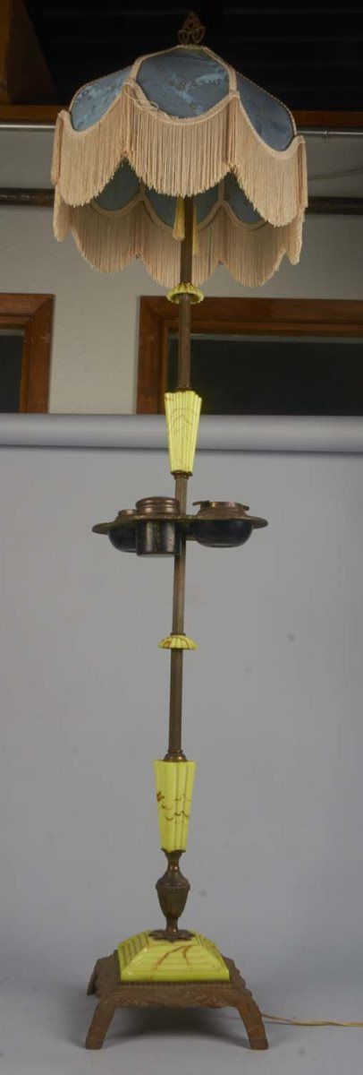 w/2 Pull Chains, Blue Brocade, Lace, & Fringe Shade, Ornate Base w/Green Glass Details Condition Very Good Size Approx. 64" tall
