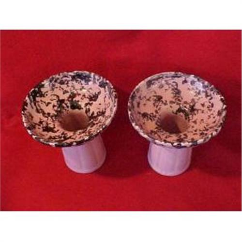Interesting pair of candleholders which are 5 inches tall, have a column type base and wide, 4 5/8 inch, saucer top. The base is a solid pink and the top is pink with black splatters. There are no chips/cracks or scratches on this pair.