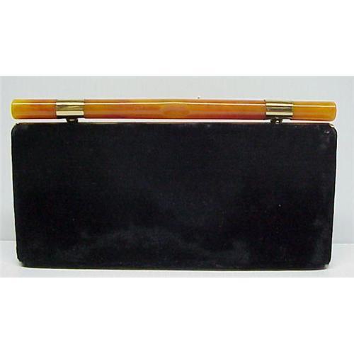 Lovely black velvet and bakelite handle clutch ladies purse,Made by Dover in USA, This is quite unique purse and i love the honey color amber like "handle", It looks like a candy, good to eat.In excellent condition but for the velvet shows a bit ware around lower part.The purse is 9" x 4 3/4". Buyer please pay 9.00 for ship. plus insurance. Thanks for looking!
