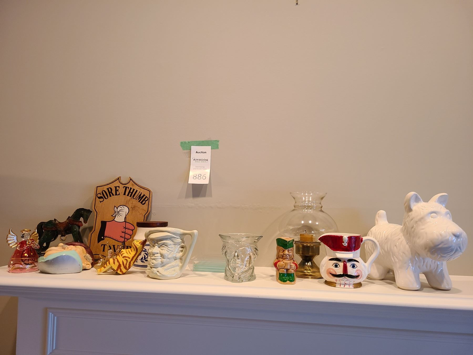 Decor includes Scottie dog, hurricane lamp, mugs, glass angel, and more. Some scratches on man smoking wall hanging. Bring packing material. Pickup 9 am.
