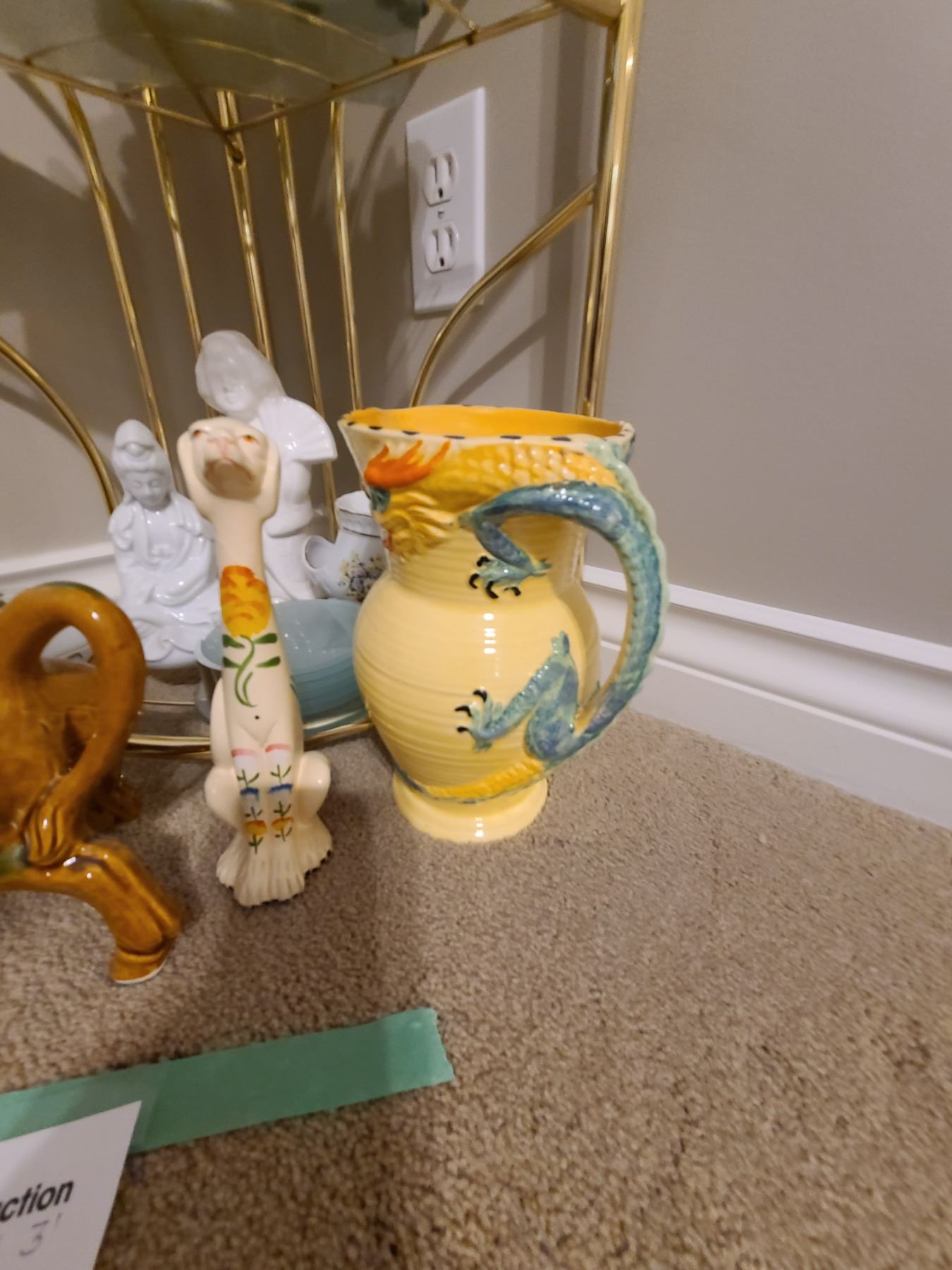 Decor, some Asian style, large seashell, bull, and pitcher included in lot. Bring packing material. Pickup 9 am.