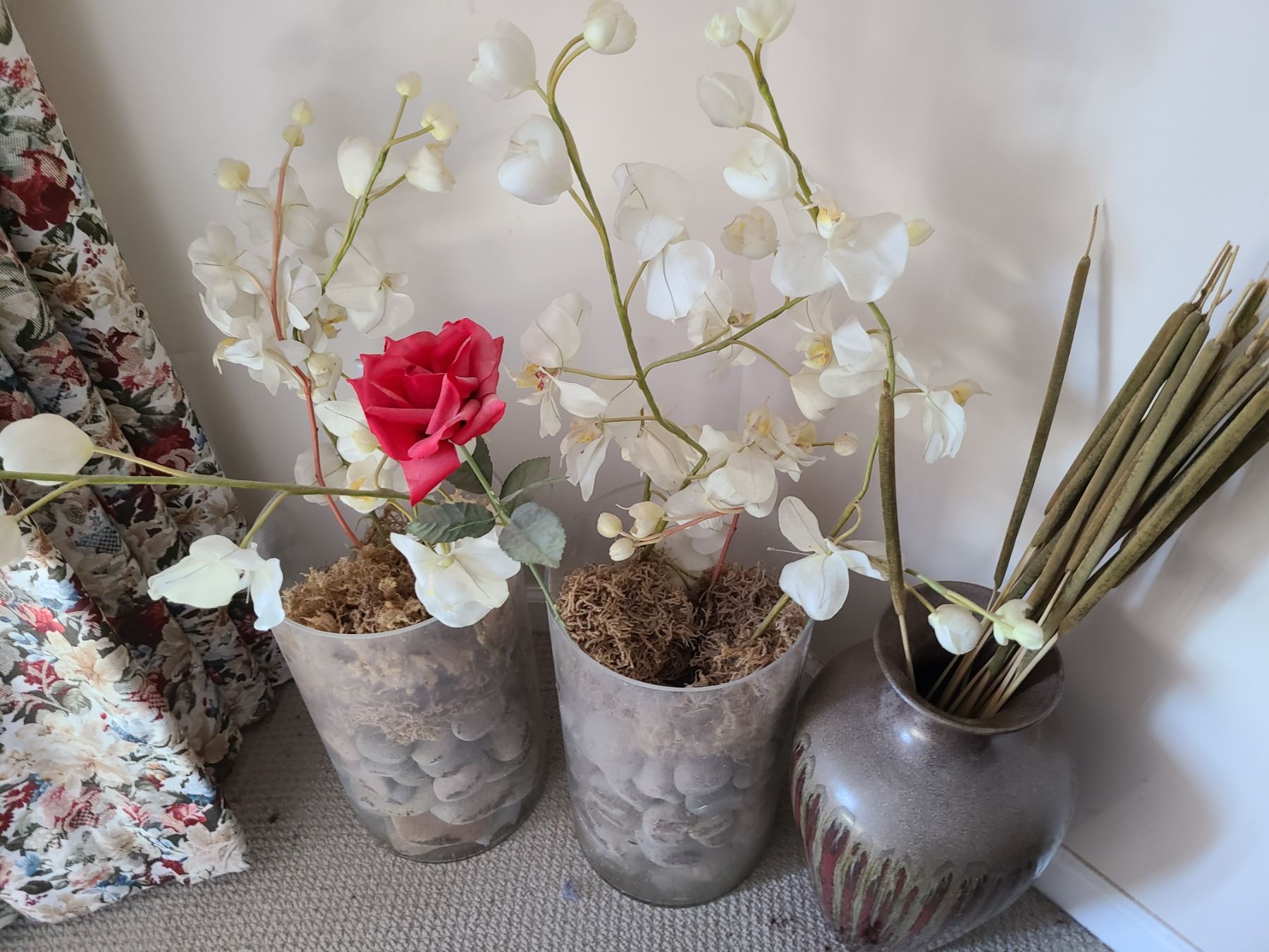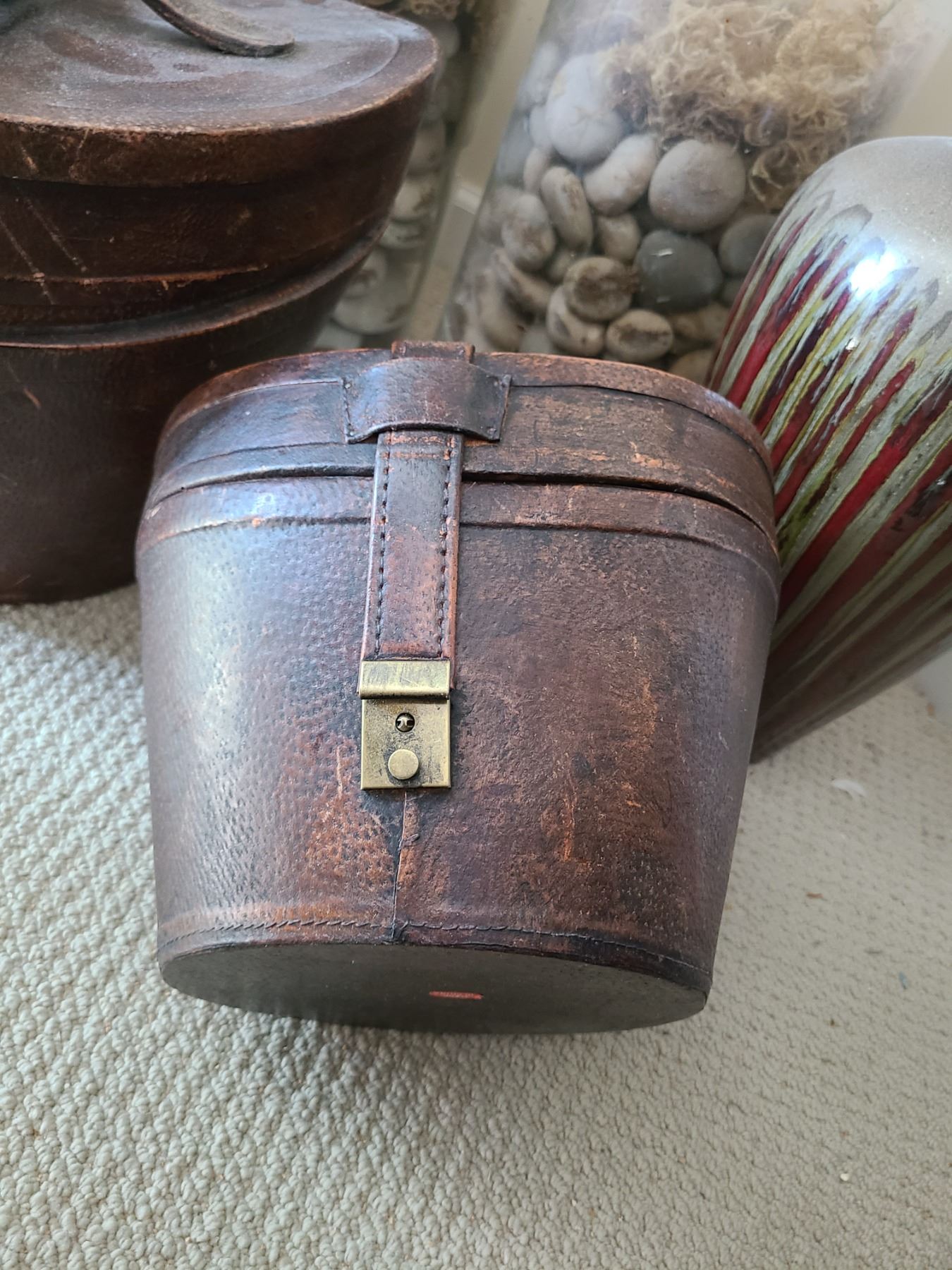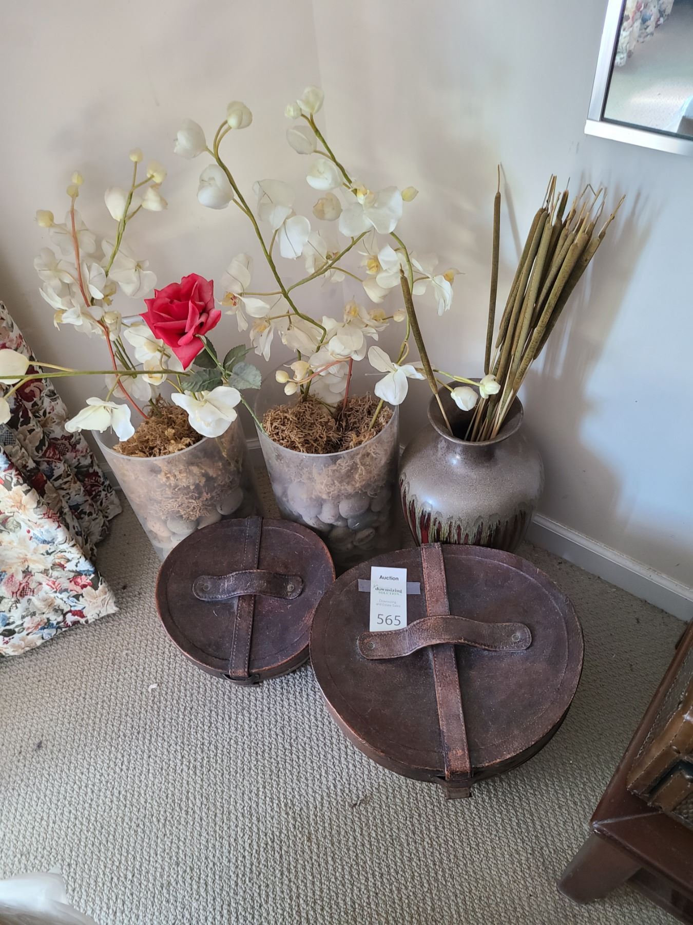 2 X 18x8 glass vases, 20 inch vase and 2 faux leather type storage cases. Picup at 9 am