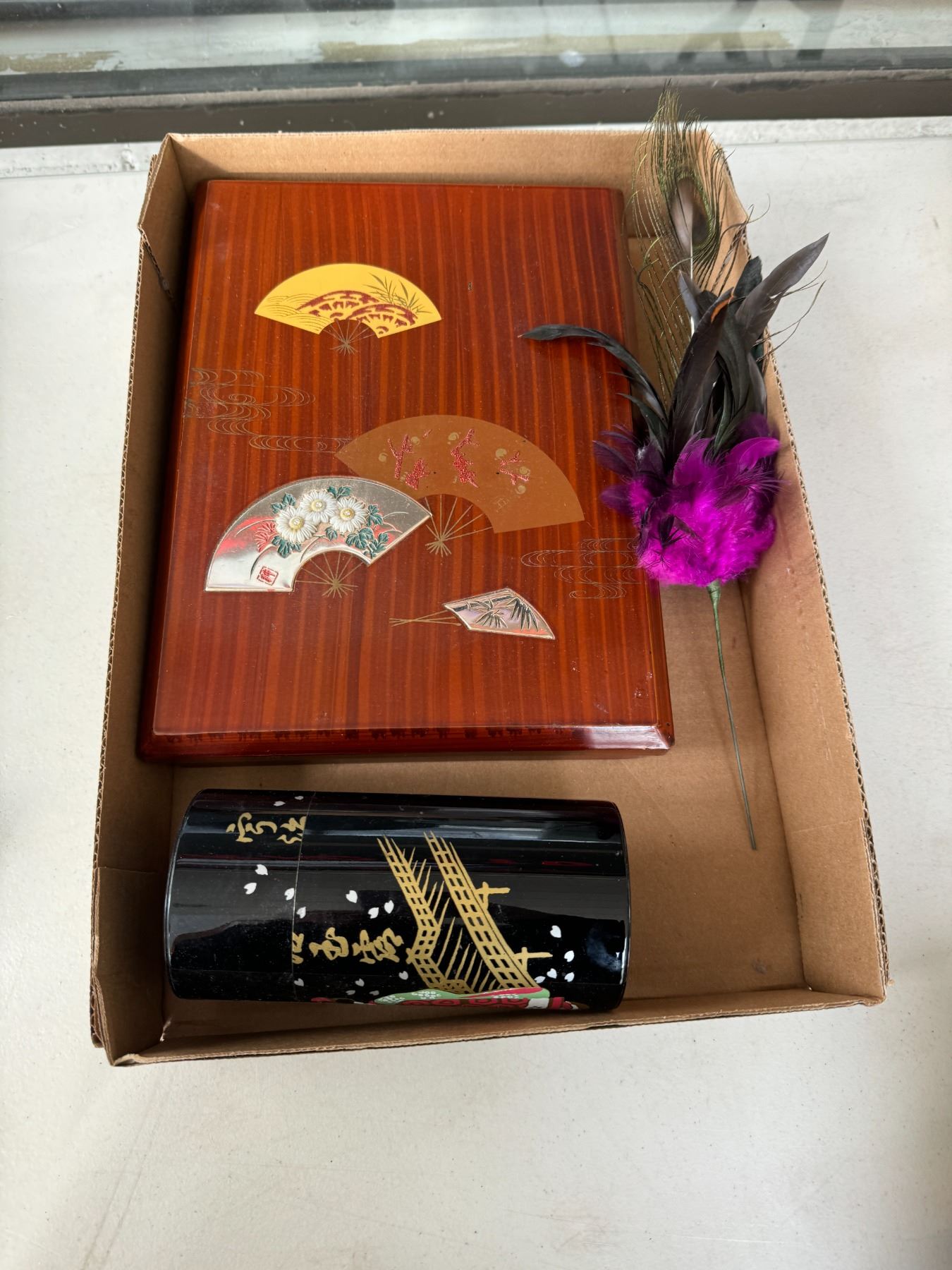 Decor, containers, and peacock feather