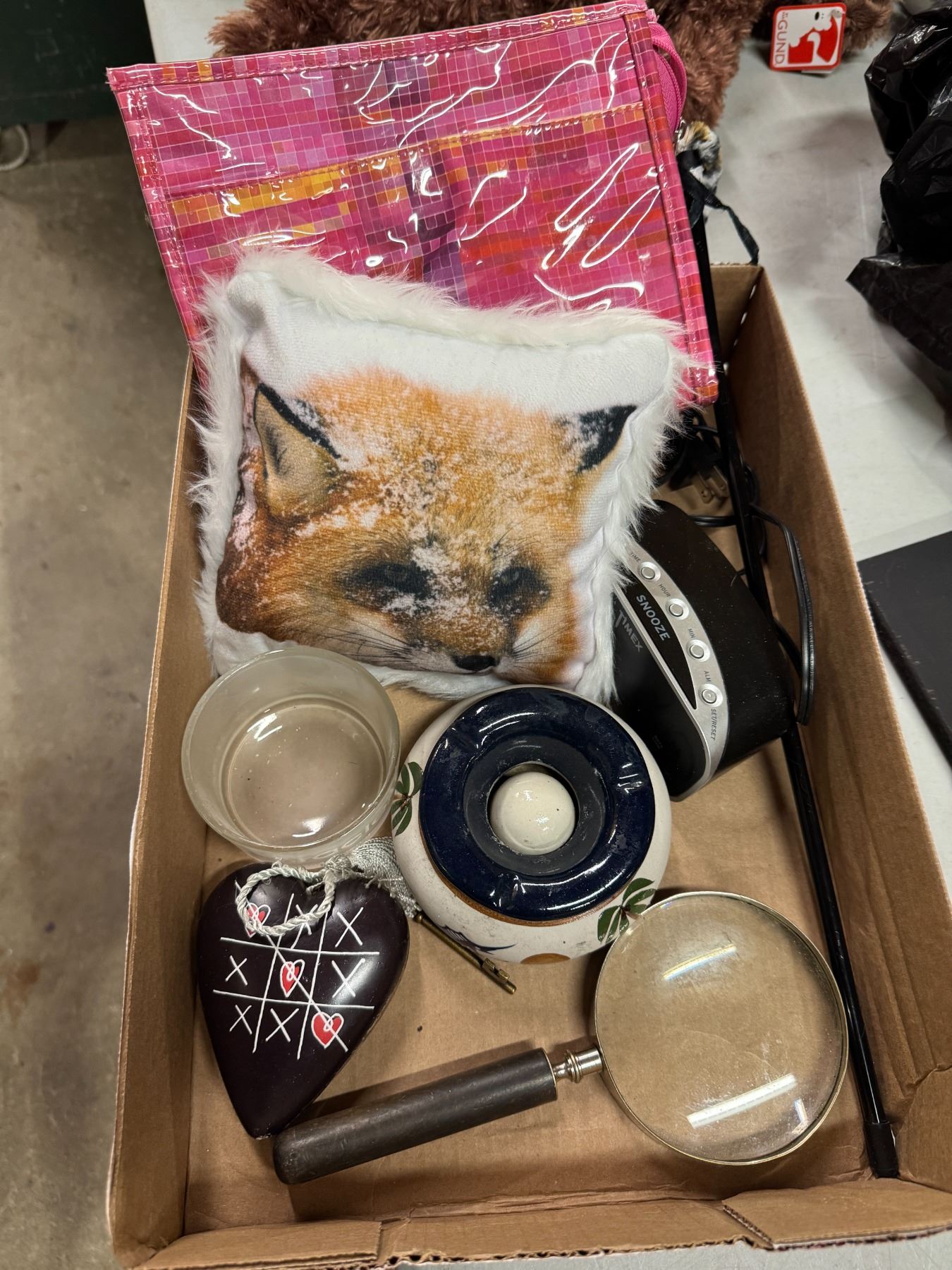 Decor, magnifying glass, Timex, alarm clock, etc.